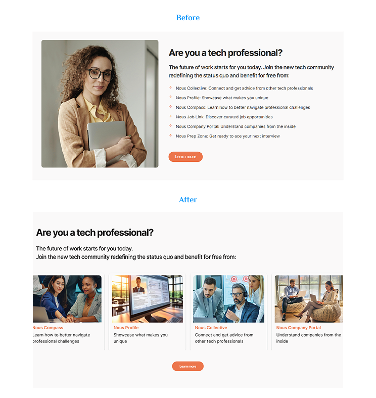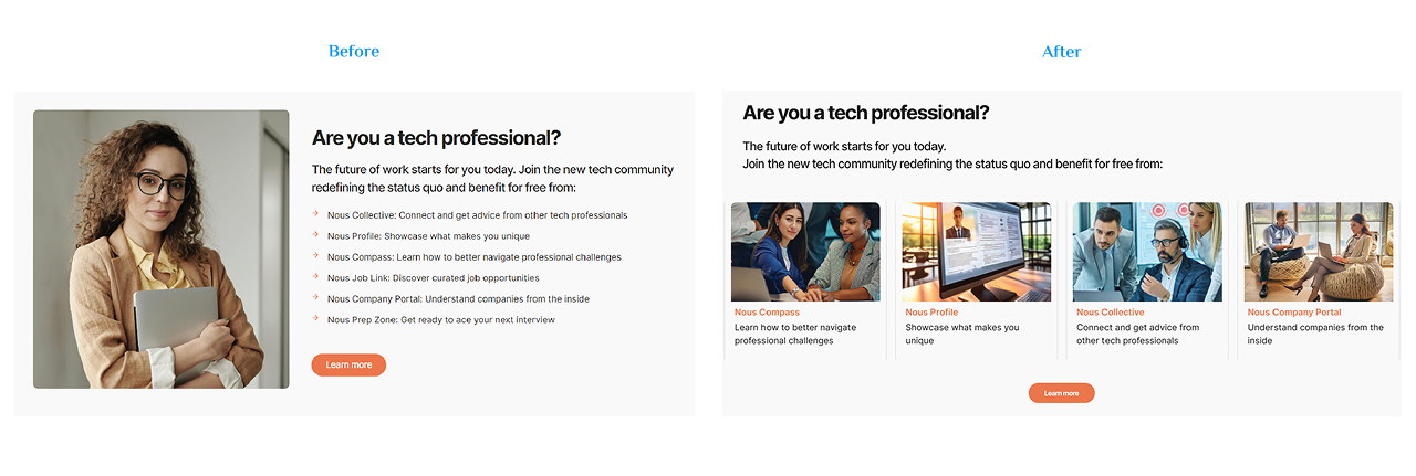 After the redesign, the home page became more user-friendly and visually appealing, with a clearer layout and improved content organization. As a result, NOUS is now positioned to stand out in its field, attracting more registrations and views, fostering greater client engagement, and ultimately contributing to the company's overall growth.
