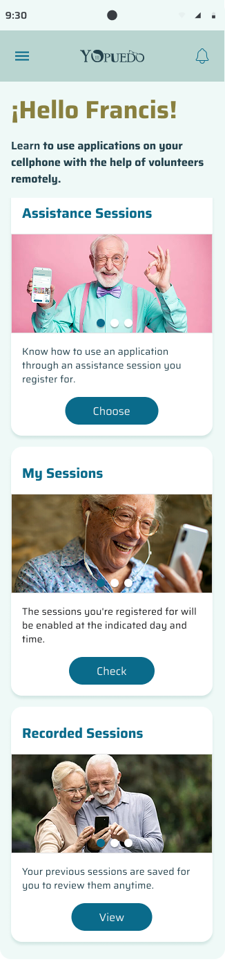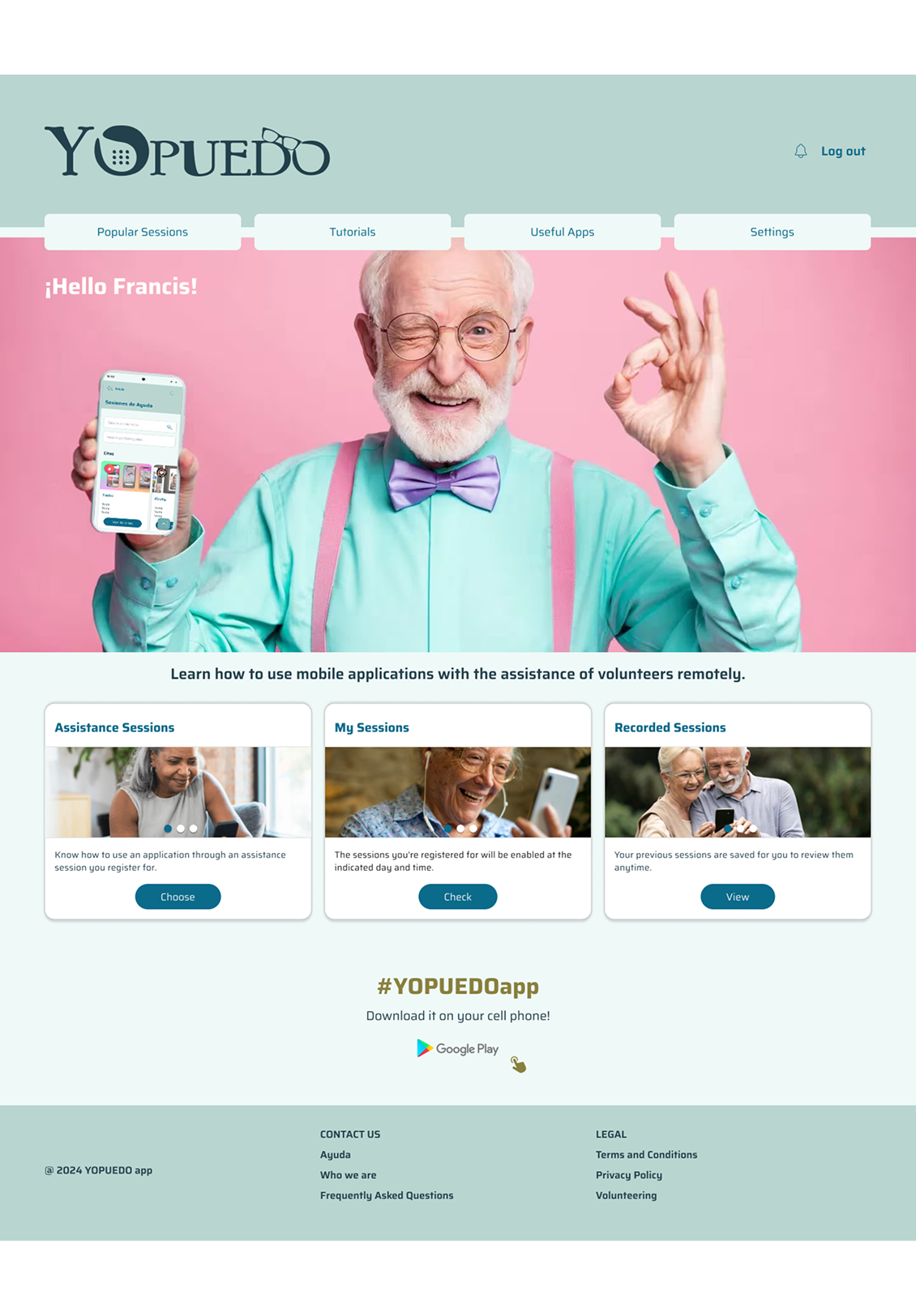 Mobile/web design that enables the elderly to access remote assistance sessions provided by volunteers in a simple way.